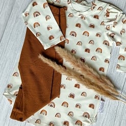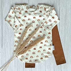 Ruffle Dress Regenboog Bruin uit de collectie van ByTasha Exclusive. Deze jurk is van heerlijk zachte jersey en draagt prettig voor jouw kleintje. De jurk heeft een wijder vallende rok, en lange mouwen met ruffles (ook leverbaar met korte mouwen). De jurk heeft een mooie veren print waardoor dit kledingstuk een musthave voor in de kledingkast is. De stof blijft mooi na het wassen. Je kunt de jurk combineren met diverse van onze andere kledingstukken uit de collectie. Varieer zoveel als je wilt! De Ruffle Dress Regenboog Bruin is ook in andere prints en kleuren verkrijgbaar.